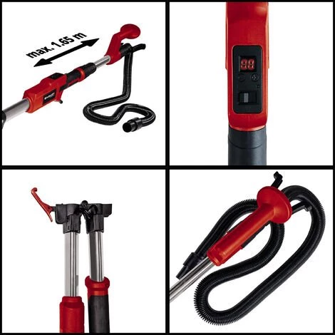 Der Einhell Trockenbauschleifer TE-DW 225 X ist ein wertvoller Helfer bei der Renovierung oder dem Ausbau der eigenen vier Wände. Ob gespachtelte Trockenbauflächen an Wand und Decke geschliffen werden sollen oder die Wände von Putz und Tapetenresten befreit werden müssen, dank des kraftvollen 750-Watt-Motors und des hochwertigen Metallwinkelgetriebes geht die Arbeit effektiv von der Hand. Mit einer Leerlaufdrehzahl von 600 bis 1.500 min-1 und einem Schleifscheibendurchmesser von 225 mm bietet der Einhell Trockenbauschleifer die technischen Voraussetzungen für einen soliden Einsatz auf der heimischen Baustelle. Eine optimale Anwendung gewährleistet dabei der wechselbare Schleifteller – ob rund oder dreieckig. Das Gelenklager sorgt für uneingeschränkte Beweglichkeit in jeder Situation. Die Lagerung des Bürstenkranzes ist gefedert. Einen schnellen Auf- und Abbau ermöglicht der klappbare Führungsholm. Der teleskopierbare Stiel ist bis zu 165 Zentimeter stufenlos einstellbar, womit ein ergonomischer Arbeitsablauf in jeder Situation – auch über Kopf – ermöglicht wird. Zum Lieferumfang gehören 3 runde Korund Schleifscheiben Ø225mm (1*P60/1*P80/1*P120) sowie 3 dreieckige Korund Schleifscheiben 285*285*285mm (1*P60/1*P80/1*P120), ebenso sind die hochwertigen Gitterleinen (1*rund, 1*dreieckig) inklusive sowie die praktische Einhell E-Box für Transport und Aufbewahrung. Ausstattung: