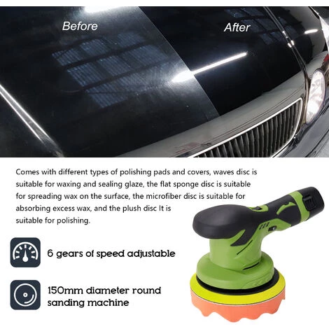 Dieser kabellose elektrische Polierer verwendet einen bürstenlosen Motor, muss die Kohlebürste nicht häufig austauschen und bietet eine lange Betriebszeit. Selbstklebende Ablage an der Unterseite zum einfachen Austauschen des Schleifpapiers. 6 einstellbare Geschwindigkeitsstufen, die Sie nach Ihren Wünschen einstellen können Anforderungen leicht. Dies ist eine Rundschleifmaschine mit einem Durchmesser von 150 mm, die praktisch ist, um Ihre Arbeitsanforderungen zu erfüllen.