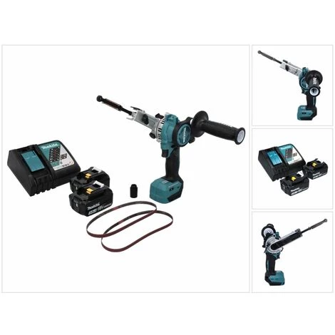 Die Makita DBS 180 Akku Bandfeile überzeugt durch seine gute Flexibilität und Performance. Der Motor ist bürstenlos (brushless), was für mehr Ausdauer, längere Lebenszeit und zu einer kompakteren Bauweise führt. Außerdem ist die Bandgeschwindigkeit in 5 unterschiedliche Stufen einzustellen. Durch die 9 mm Bandbreite ist die Feile perfekt für Arbeiten an schmalen Stellen, zugänglichen Konturen, Rundungen und Schweißnähten. Des Weiteren ist der mitgelieferte Seitengriff sehr praktisch, weil dadurch eine leichte und sichere Führung gewährleistet wird. Der Schnellspannverschluss sorgt zudem für einen schnellen und einfachen Wechsel des Schleifbandes. Hinzu kommt noch eine LED die Arbeiten in Dunkelheit ermöglicht und für eine gute Beleuchtung des zu bearbeitenden Objektes sorgt. Außerdem wird ein Absaugadabter mitgeliefert, der den Anschluss eines externen Saugers ermöglicht. Der Absaugeanschluss ist so gelegen, dass die abgefeilten Späne nicht im Gehäuse bleiben sonders sofort rausgesaugt werden. Sehr Vorteilhaft sind die nahezu 90 Grad Neigungswinkel, die zu einer hohen Flexibilität führen und somit das Arbeiten in unterschiedlichen Positionen ermöglichen. Die Makita Akku Bandfeile besticht durch sein durchdachtes Design und durch seine gute Verarbeitung.