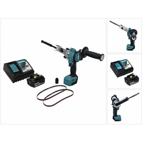 Die Makita DBS 180 Akku Bandfeile überzeugt durch seine gute Flexibilität und Performance. Der Motor ist bürstenlos (brushless), was für mehr Ausdauer, längere Lebenszeit und zu einer kompakteren Bauweise führt. Außerdem ist die Bandgeschwindigkeit in 5 unterschiedliche Stufen einzustellen. Durch die 9 mm Bandbreite ist die Feile perfekt für Arbeiten an schmalen Stellen, zugänglichen Konturen, Rundungen und Schweißnähten. Des Weiteren ist der mitgelieferte Seitengriff sehr praktisch, weil dadurch eine leichte und sichere Führung gewährleistet wird. Der Schnellspannverschluss sorgt zudem für einen schnellen und einfachen Wechsel des Schleifbandes. Hinzu kommt noch eine LED die Arbeiten in Dunkelheit ermöglicht und für eine gute Beleuchtung des zu bearbeitenden Objektes sorgt. Außerdem wird ein Absaugadabter mitgeliefert, der den Anschluss eines externen Saugers ermöglicht. Der Absaugeanschluss ist so gelegen, dass die abgefeilten Späne nicht im Gehäuse bleiben sonders sofort rausgesaugt werden. Sehr Vorteilhaft sind die nahezu 90 Grad Neigungswinkel, die zu einer hohen Flexibilität führen und somit das Arbeiten in unterschiedlichen Positionen ermöglichen. Die Makita Akku Bandfeile besticht durch sein durchdachtes Design und durch seine gute Verarbeitung.