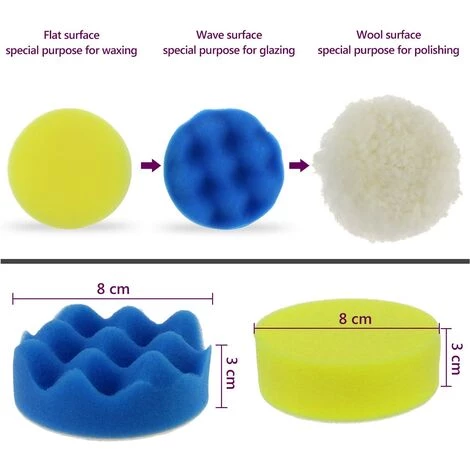 Schwammauflage Größe: 3.15 * 0.83 Zoll, Paket umfaßte 8pcs Schwammauflage, Wollpuffer 1pcs, 1pcs Gewindebohreradapter
