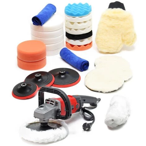 | Zubehör | 1 x Stützteller (mit Kletthaftung) Ø 125 mm / Gewinde M14 1 x Stützteller (mit Kletthaftung) Ø 150 mm / Gewinde M14 1 x Stützteller (mit Kletthaftung) Ø 180 mm / Gewinde M14 5 x Polierschwamm Ø 180×37 mm / weiß – (weich) 2 x Polierschwamm Ø 150×50 mm / orange – (medium) 3 x Polierschwamm Ø 150×37 mm / weiß / gewaffelt – (weich) 1 x Polierschwamm Ø 150×37 mm / orange / gewaffelt – (medium) 1 x Polierschwamm Ø 150×37 mm / schwarz / gewaffelt – (medium) 1 x Polierschwamm Ø 150×37 mm / weiß / gewaffelt – (hart) 1 x Polierschwamm Ø 150×37 mm / blau / gewaffelt – (abrasiv) 3 x Polierfell Ø 180 mm – (medium) 2 x Microfaser Poliertuch Blau 1 x Spezial-Waschhandschuh |